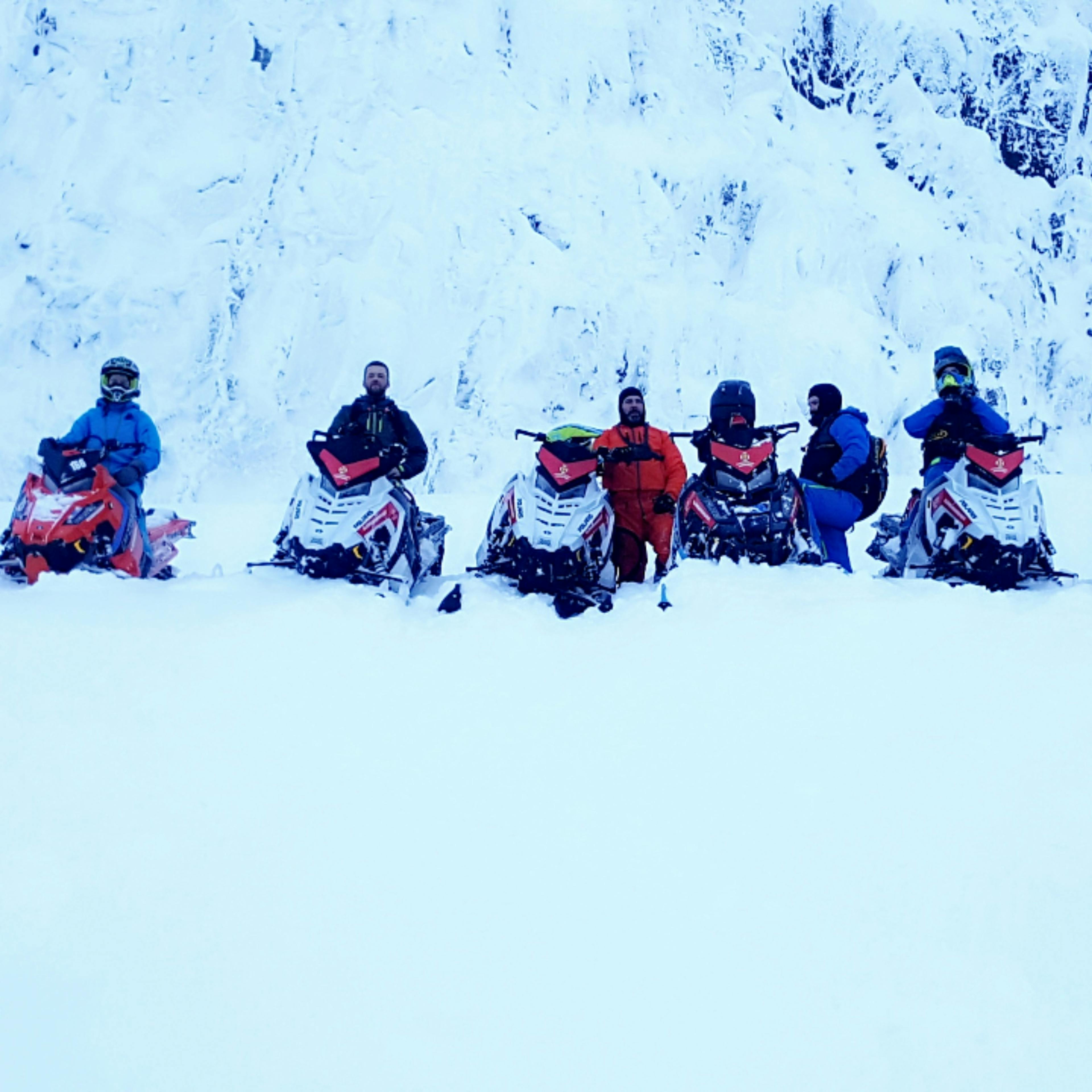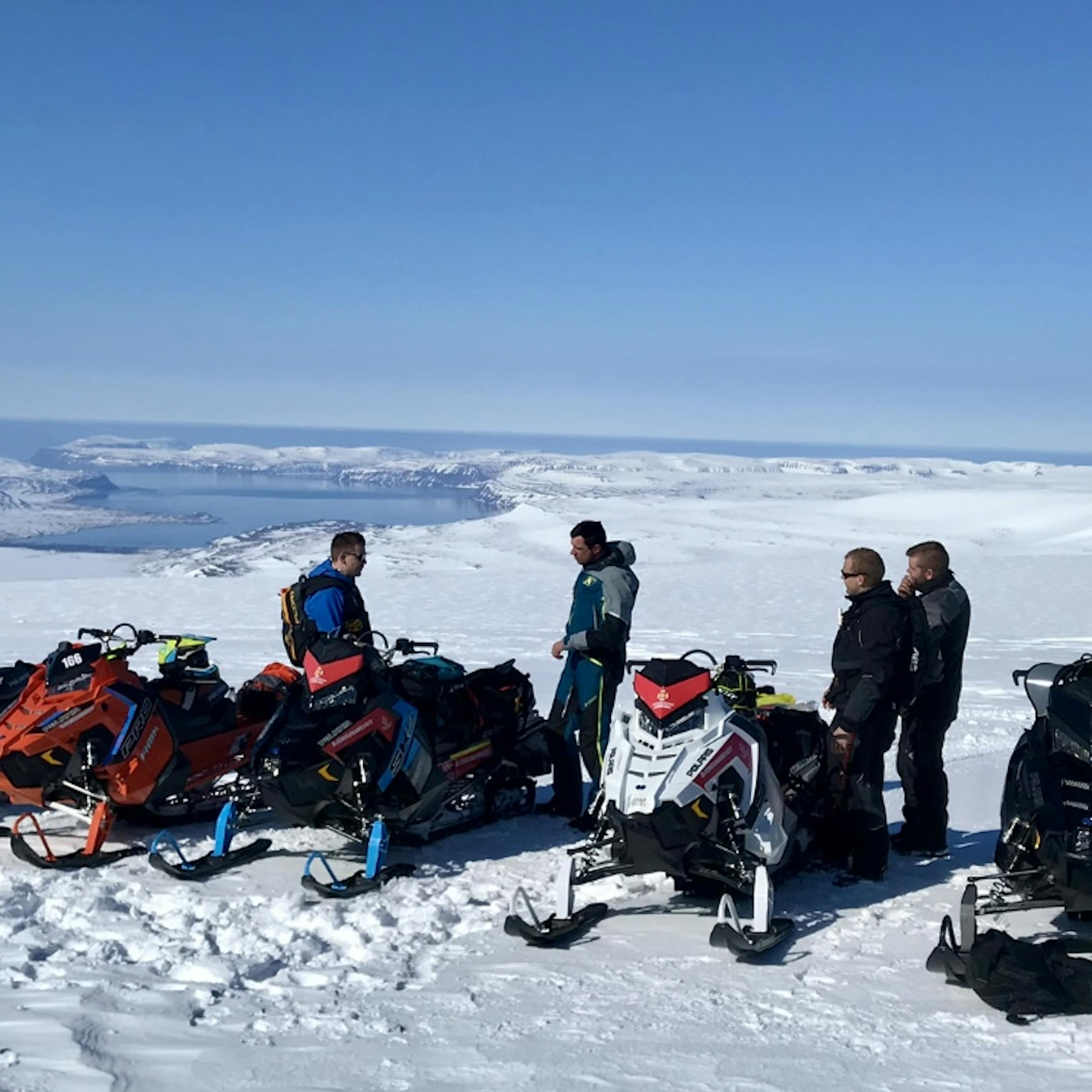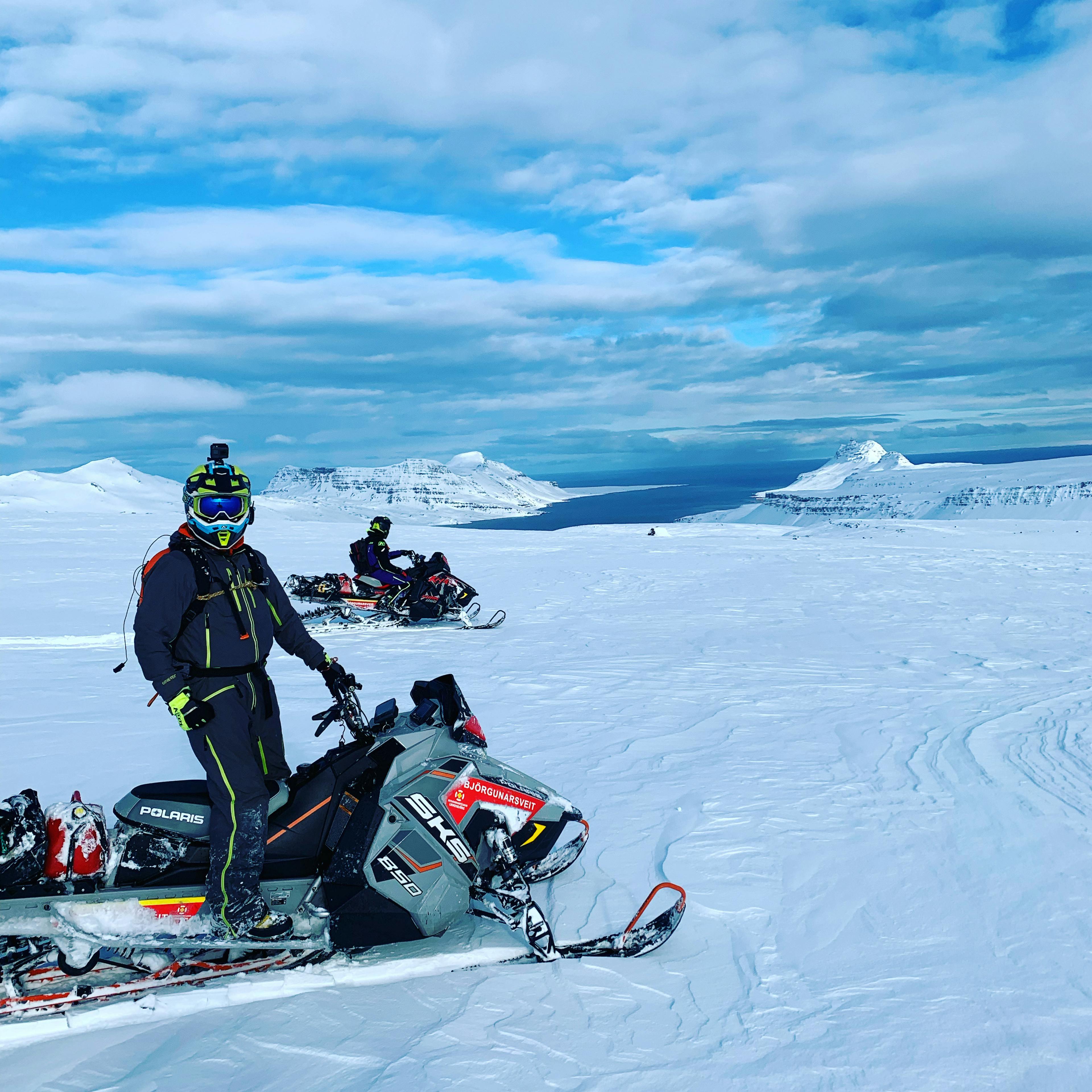 Tetra talstöð fyrir hvern sleða, heilgalli - ysta lag, lambhúshetta, ullarnærföt, miðlag - flísbuxur / peysa, ullarpeysa, góðir sokkar / ull, 2 pör vettlingar, poki með auka fötum, vélsleðahjálmur, 2 x gleraugu á hjálm, hjálmaljós, snjóflóðaýlir, snjóflóðabakpoki, snjóflóðastöng, skófla