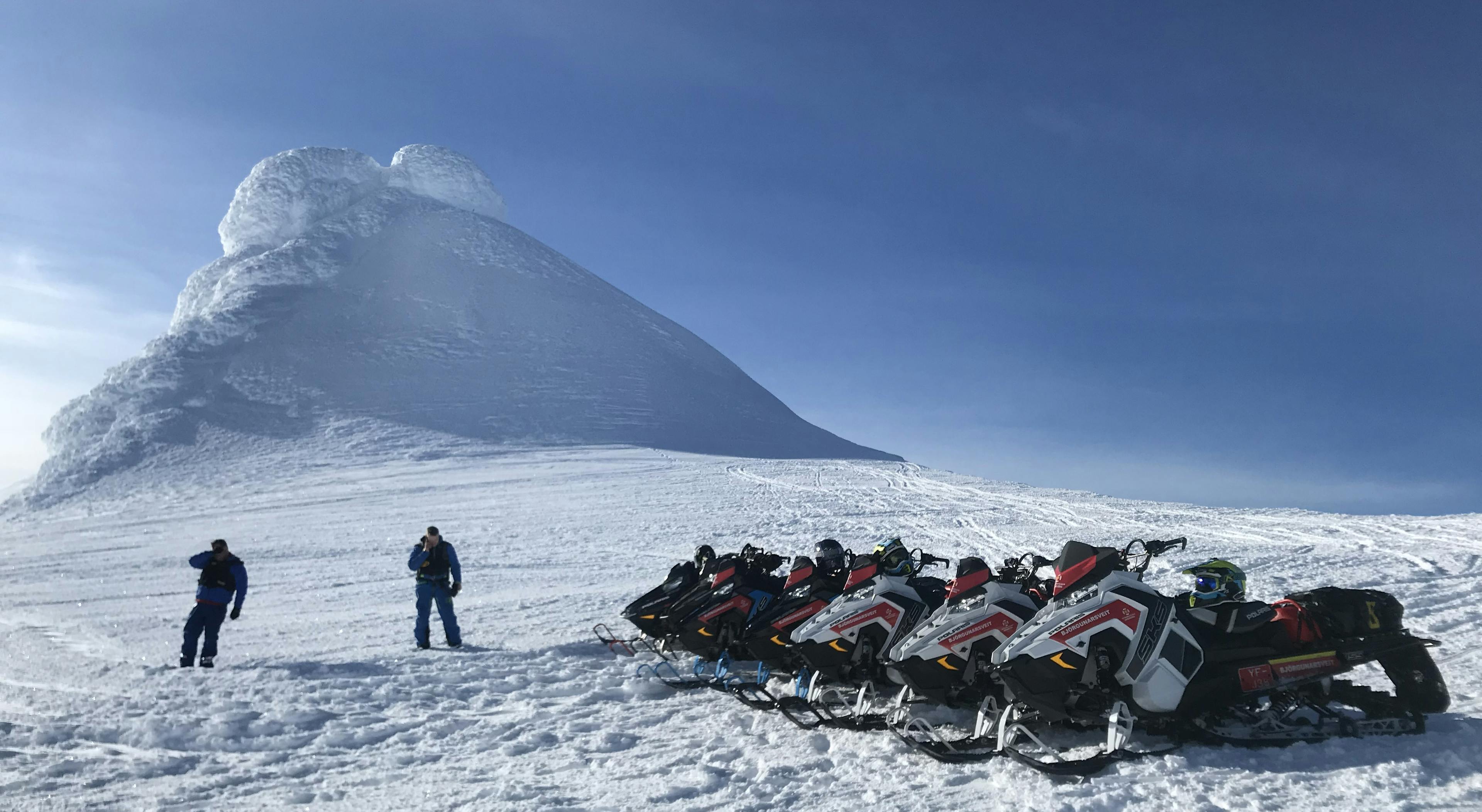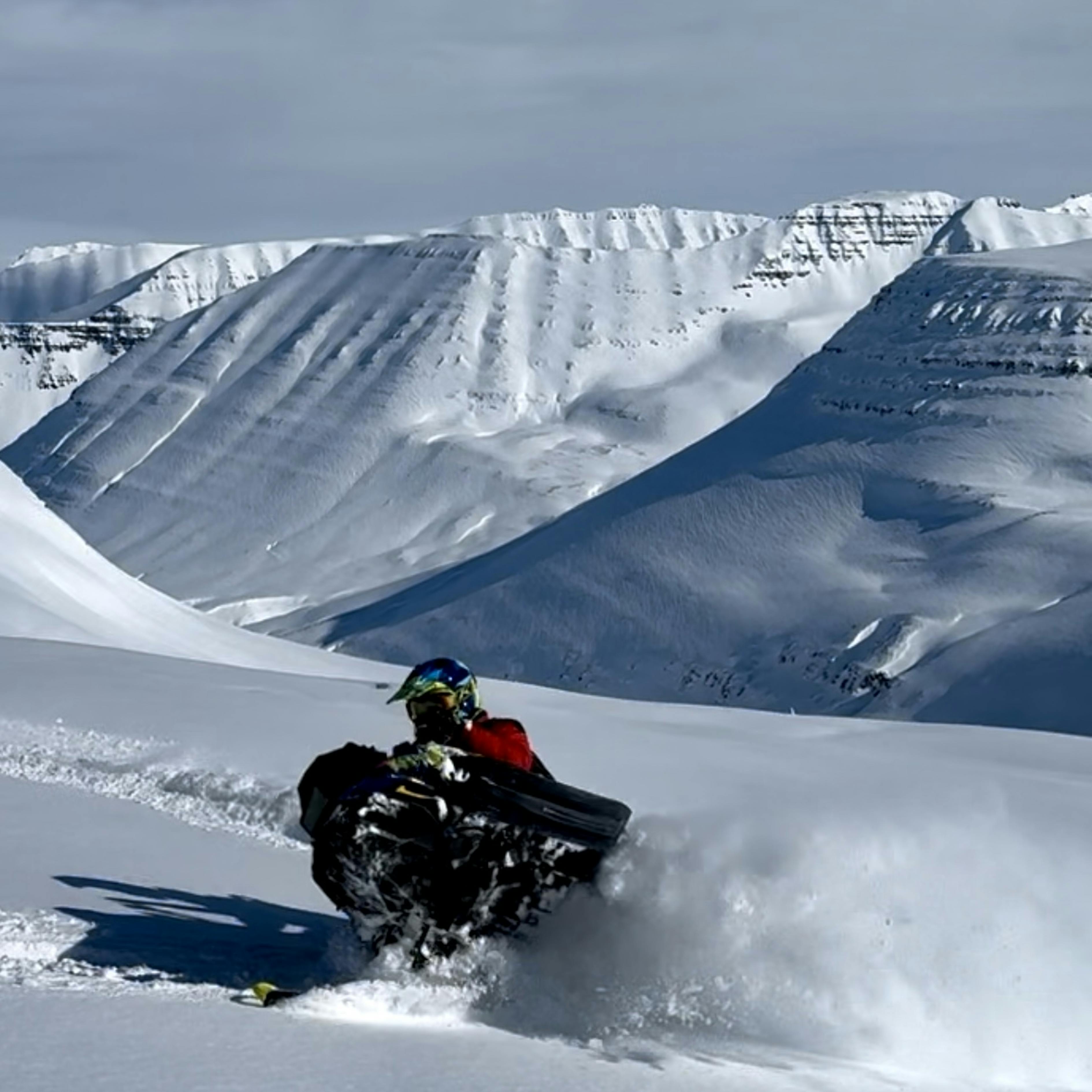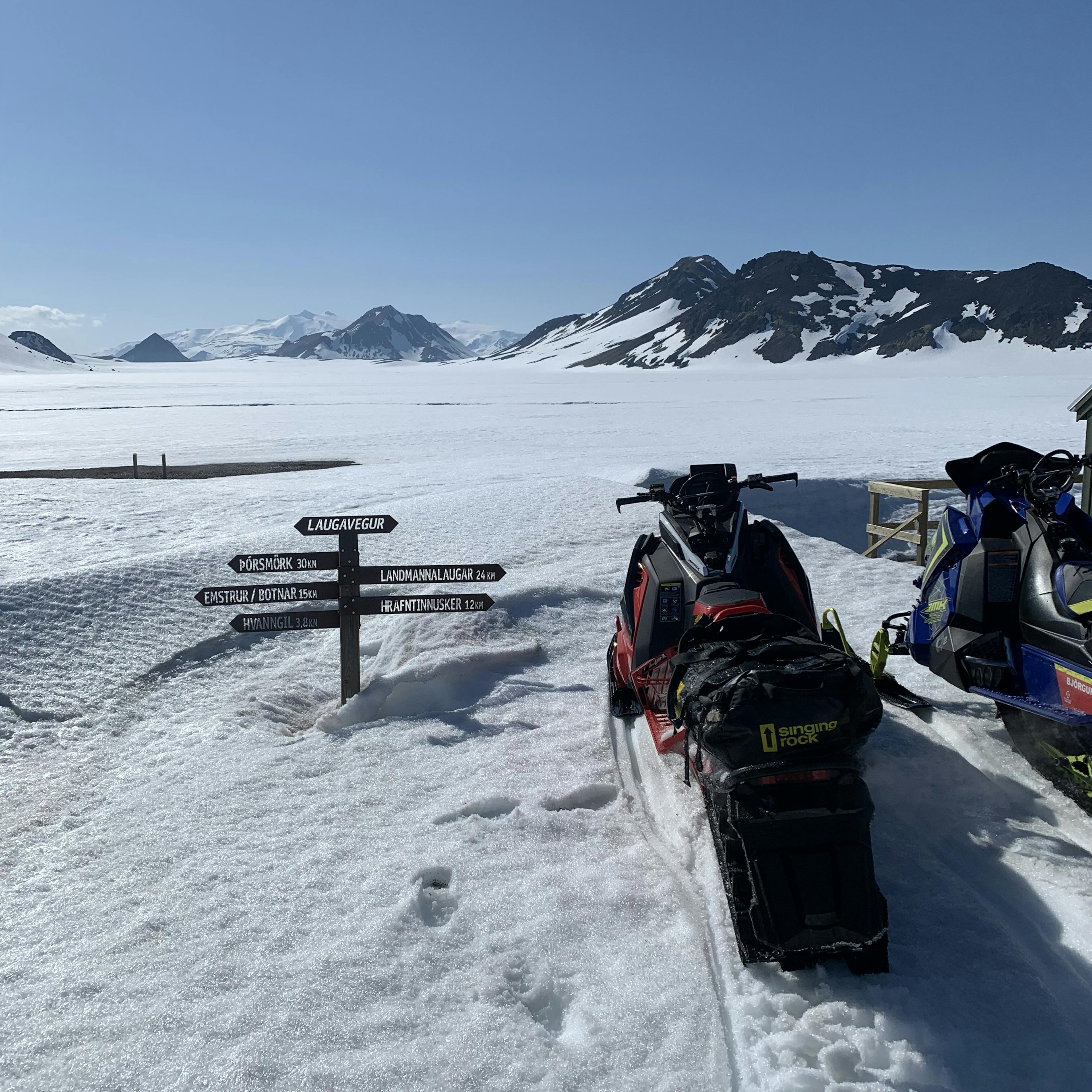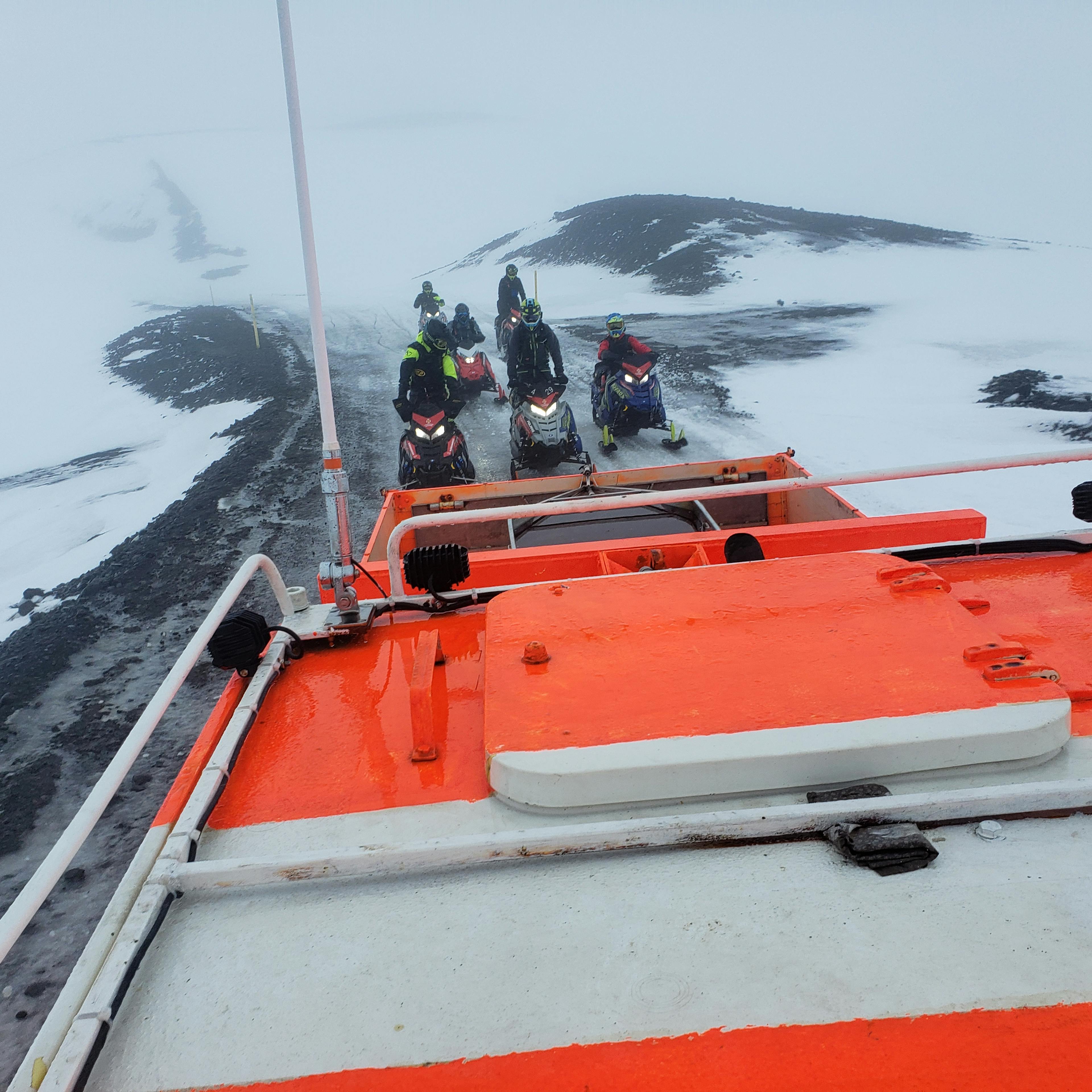 Tetra talstöð fyrir hvern sleða, heilgalli - ysta lag, lambhúshetta, ullarnærföt, miðlag - flísbuxur / peysa, ullarpeysa, góðir sokkar / ull, 2 pör vettlingar, poki með auka fötum, vélsleðahjálmur, 2 x gleraugu á hjálm, hjálmaljós, snjóflóðaýlir, snjóflóðabakpoki, snjóflóðastöng, skófla
