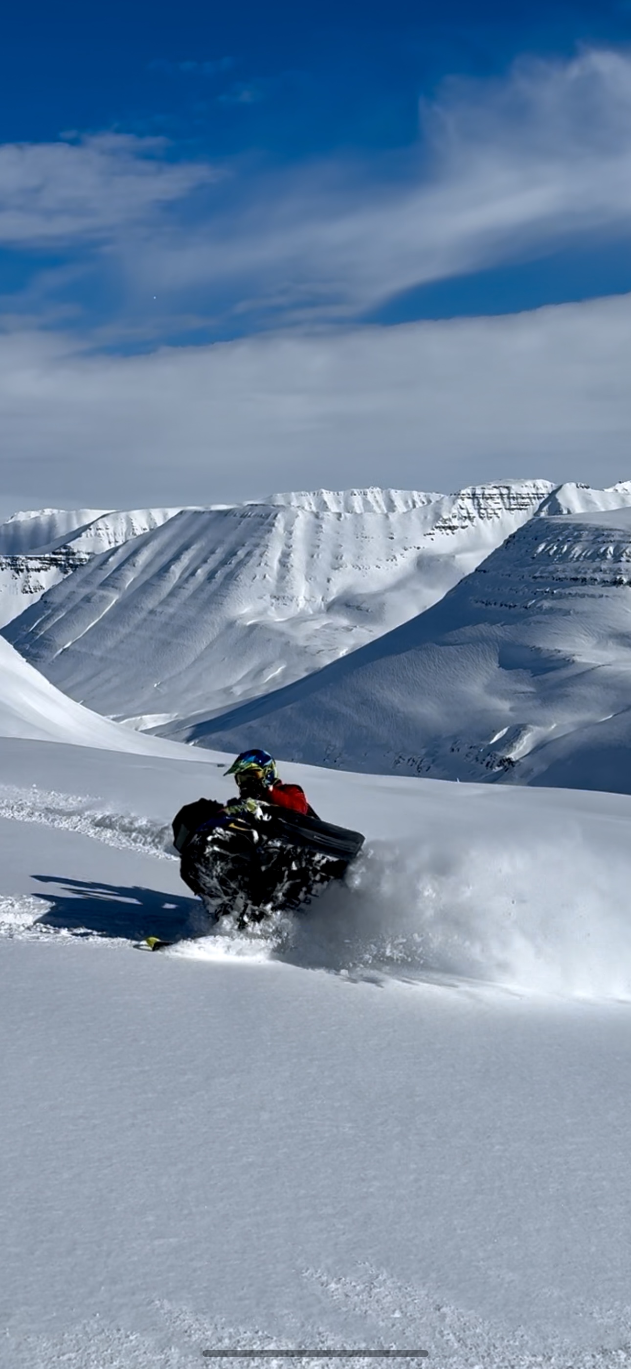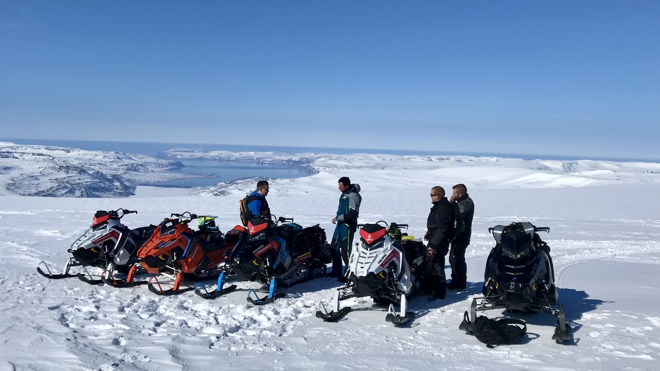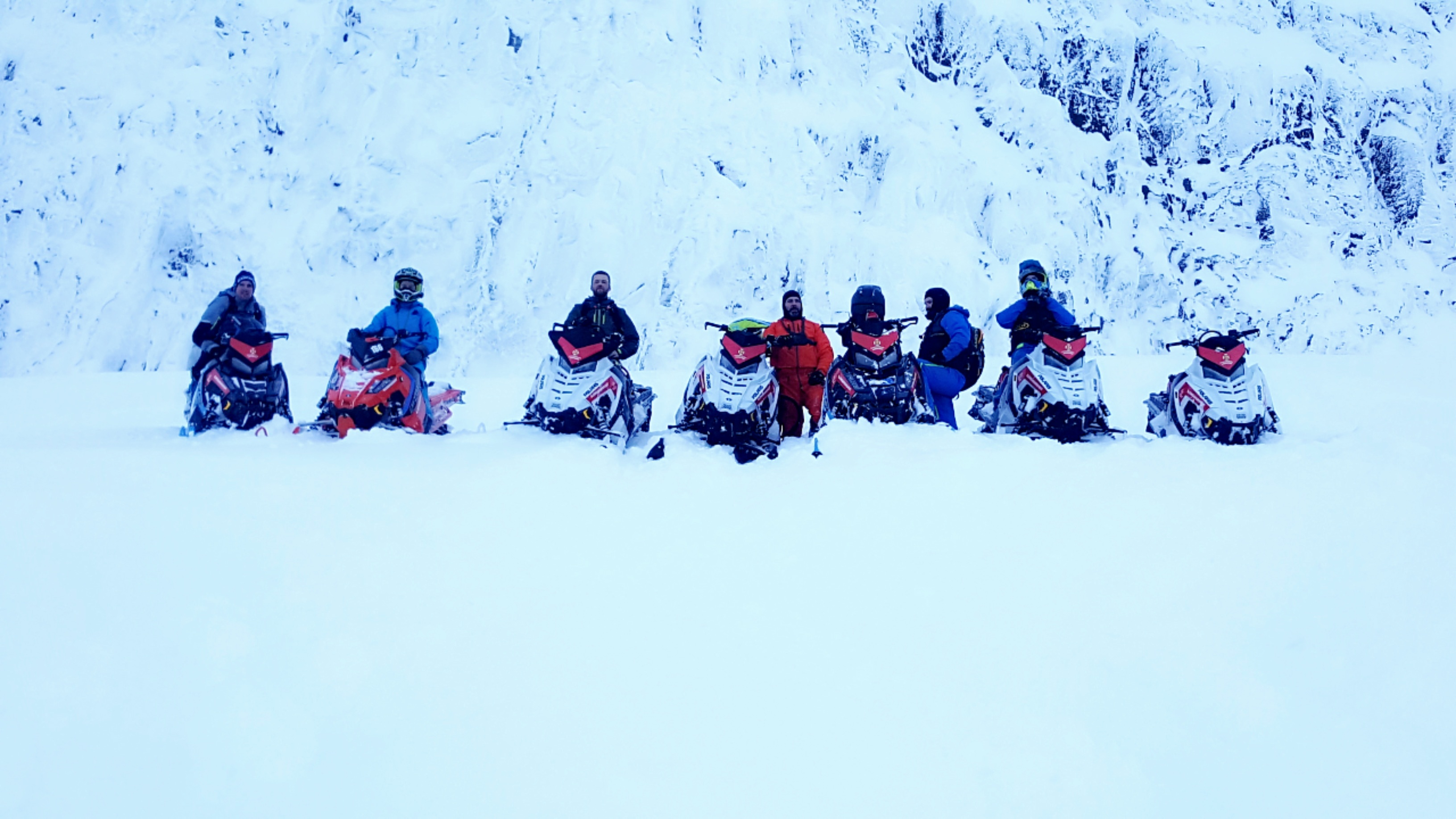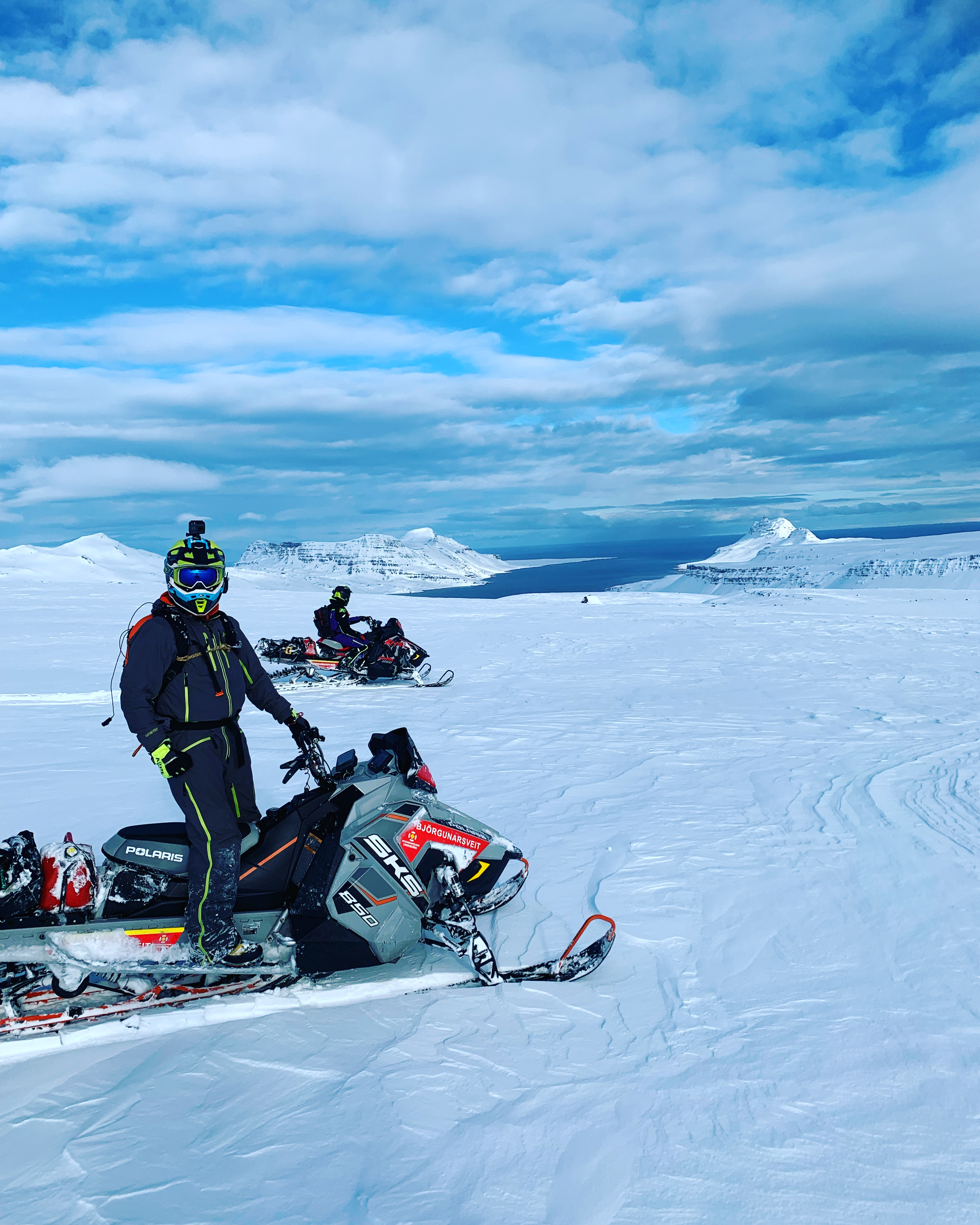 Tetra talstöð fyrir hvern sleða, heilgalli - ysta lag, lambhúshetta, ullarnærföt, miðlag - flísbuxur / peysa, ullarpeysa, góðir sokkar / ull, 2 pör vettlingar, poki með auka fötum, vélsleðahjálmur, 2 x gleraugu á hjálm, hjálmaljós, snjóflóðaýlir, snjóflóðabakpoki, snjóflóðastöng, skófla