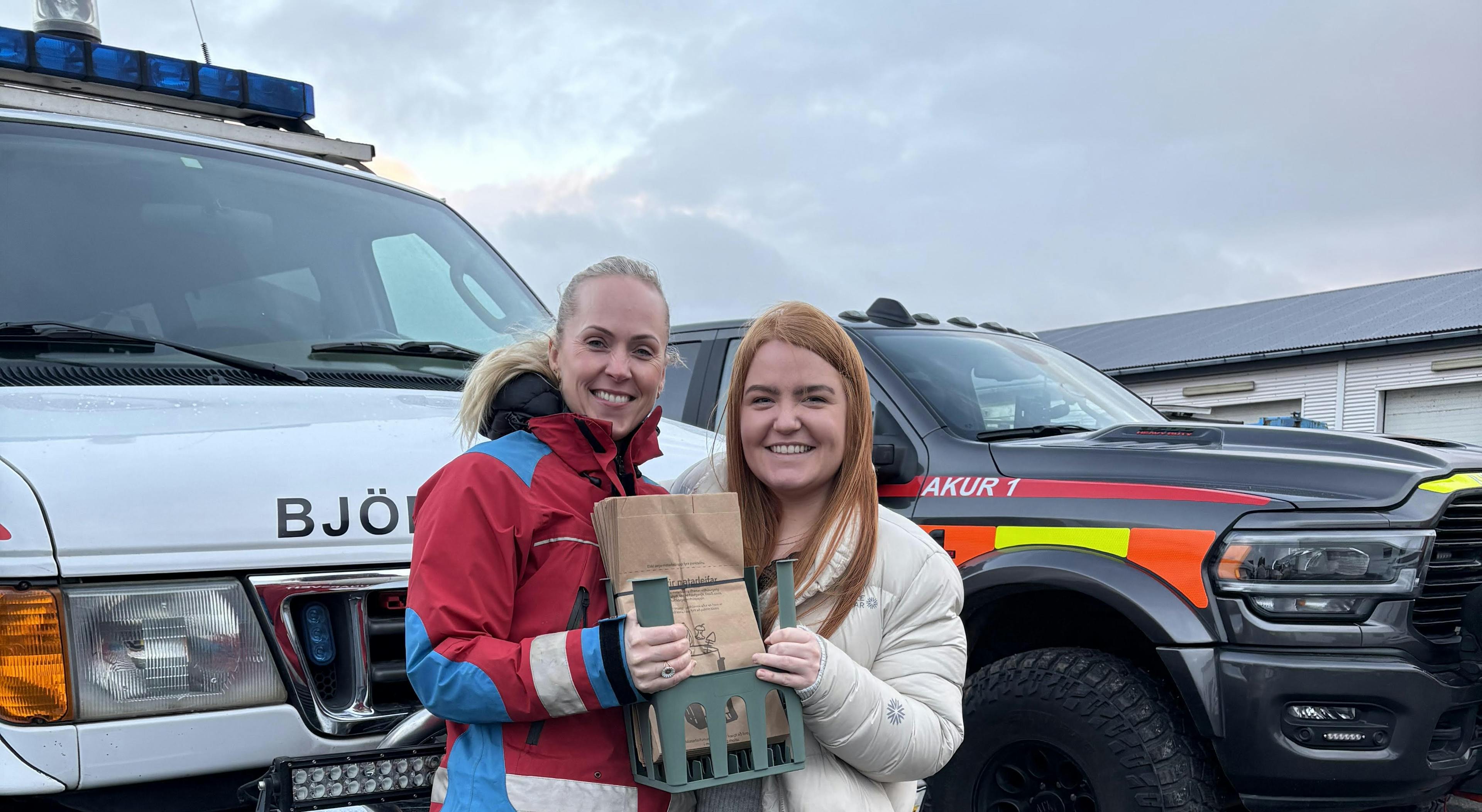 Á myndinni er Andrea Ýr Arnarsdóttir oddviti Hvalfjarðarsveitar að taka á móti fyrstu plastgrindinni frá Belindu Eir Engilbertsdóttur félaga í Björgunarfélagi Akraness