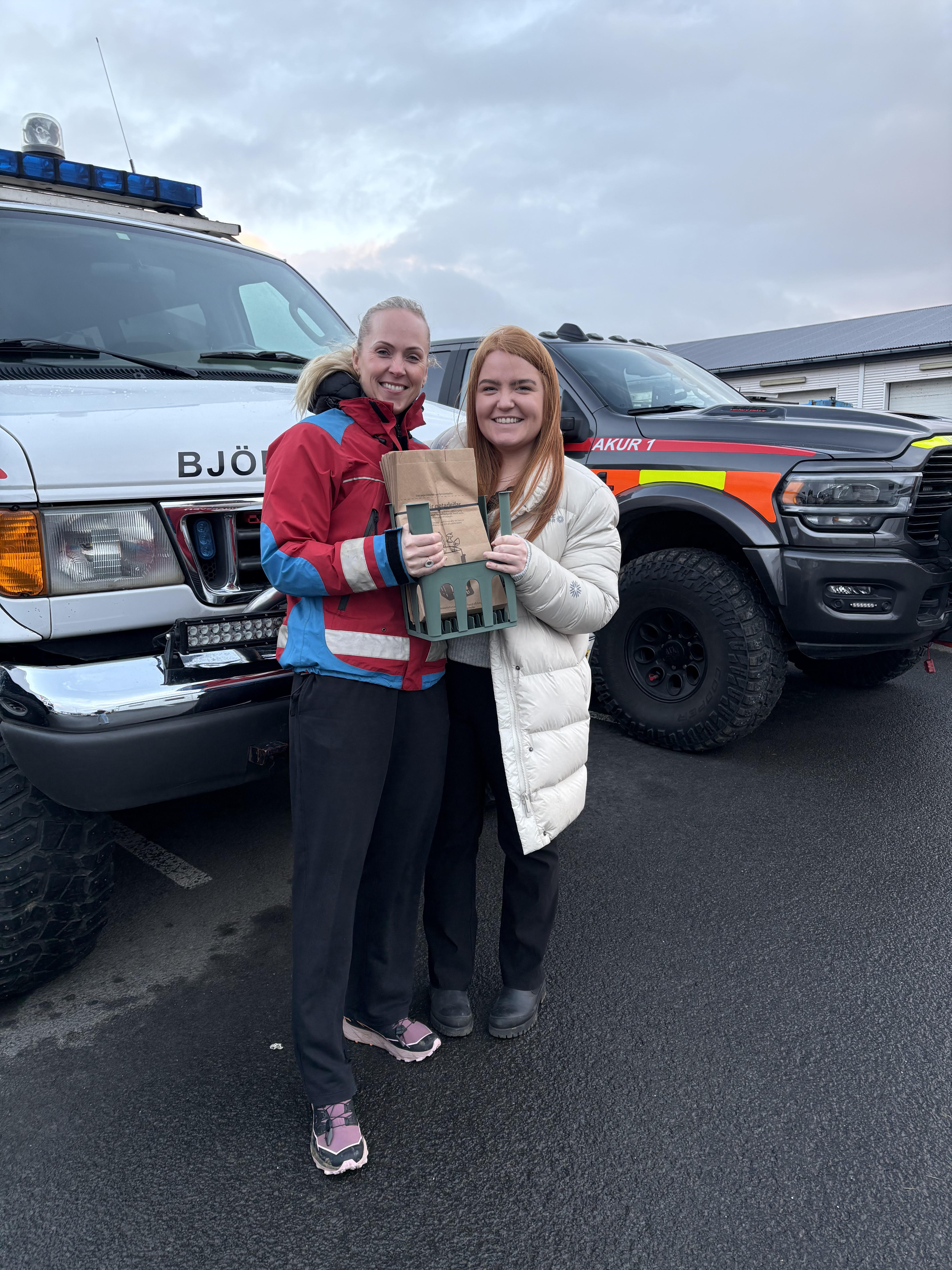Á myndinni er Andrea Ýr Arnarsdóttir oddviti Hvalfjarðarsveitar að taka á móti fyrstu plastgrindinni frá Belindu Eir Engilbertsdóttur félaga í Björgunarfélagi Akraness